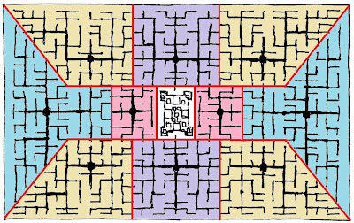 Podéis comprobar ahora cómo el plano del nivel prohibido de Vikatee se construyó dividiendo el rectángulo de la ciudad en regiones cercanas a una serie de puntos, y trazando árboles similares a los de Sierpinksi a partir de éstos. En realidad me salté las reglas de ambos (Voronoi y Sierpinski) cuando me convino, pero la inspiración está ahí, ja ,ja.