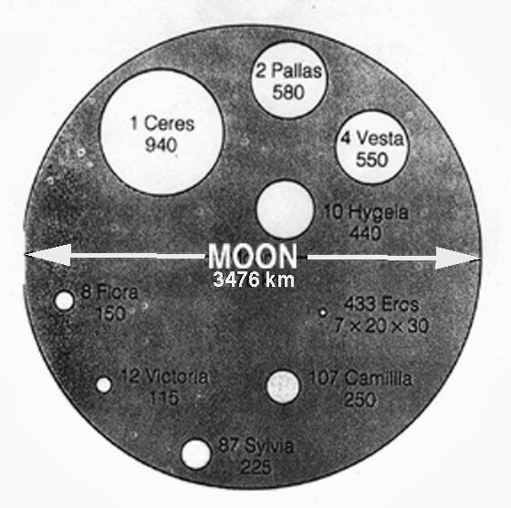 En este dibujo podéis ver el tamaño relativo de los mayores asteroides respecto a la Luna: