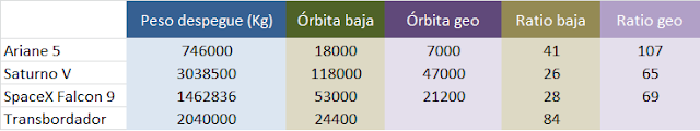 Para llevar una carga a una órbita baja, como la del transbordador espacial o la estación espacial internacional, se requiere un cohete que pesa (con el combustible) de 25 a 80 veces más que la carga. Y para transportar hasta la órbita geoestacionaria y desde allí escapar a la gravedad terrestre se requiere un sistema que pesa entre 65 y más de 100 veces la carga útil.