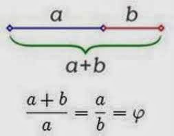 Como su nombre indica, la razón áurea phi es un cociente entre dos números. Se puede interpretar geométricamente como la relación entre dos segmentos rectos (a y b) tal que la longitud del segmento largo (a) dividido por el corto (b) es también igual al cociente entre la suma de los dos (a + b) dividida por el segmento largo (a), tal como expresa la siguiente figura.