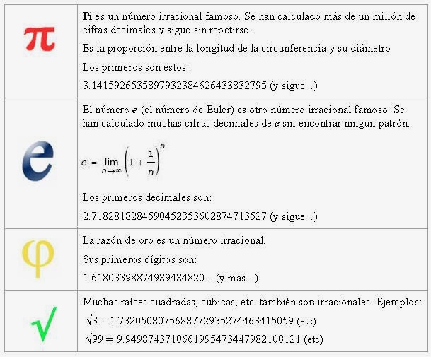 En Matemáticas existen diferentes tipos de números. Todos conocemos los enteros y los fraccionarios (el cociente de dos enteros). También usamos los números reales (corresponden a la longitud de un segmento de recta o a una distancia). No todos los reales son fraccionarios, se trata de los números irracionales, que no se pueden calcular como un cociente de enteros.