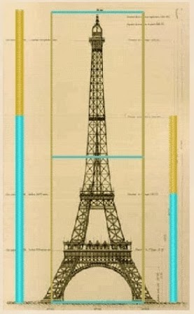 El uso de la razón áurea no se limita a los antiguos. Por ejemplo, las diferentes secciones de la Torre Eiffel fueron diseñadas para que su altura estuviera en proporciones mutuas iguales a la razón áurea, como se observa en estas figuras.