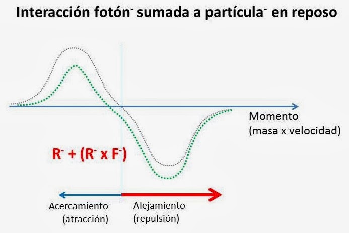 Por otro lado, si sumamos la función de onda en reposo de una partícula receptora negativa (que tiene signo negativo, hacia abajo) con la onda resultante de la opción de recibir el fotón emitido por otra carga negativa, ésta segunda se desplazará hacia abajo.